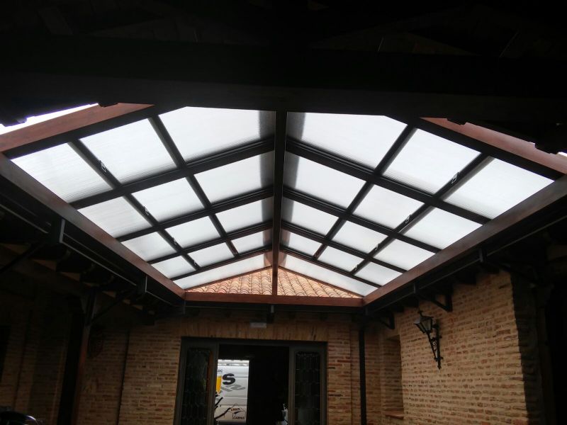Techo fijo en zonas de descuadre realizado con, policarbonato celular incoloro de 16mm.